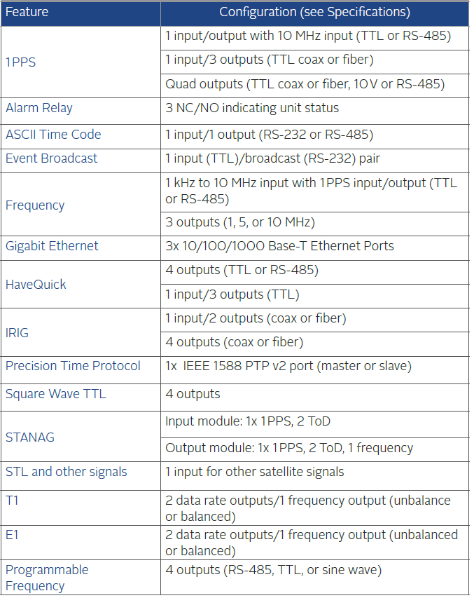 It comes with a 10/100 Base-T network port and 1 each 1PPS and 10 MHz output signals. Order option modules for additional input/output functions.