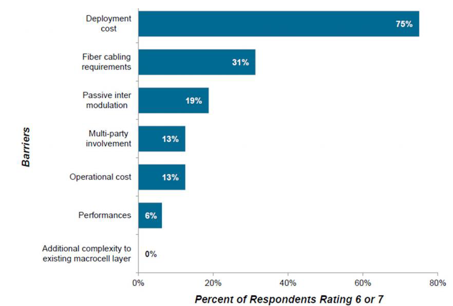 The most established cellular neutral host solution is the distributed antenna system (DAS), but this has severe limitations for any but the largest enterprises and public spaces.From below figure , a study by Infonetics for Viavi Solutions , summarises the main reasons. The greatest of these is deployment cost, which was seen as a barrier by 75% of the survey respondents. Others relate to deployment issues such as fiber cabling requirements, the second most cited barrier.